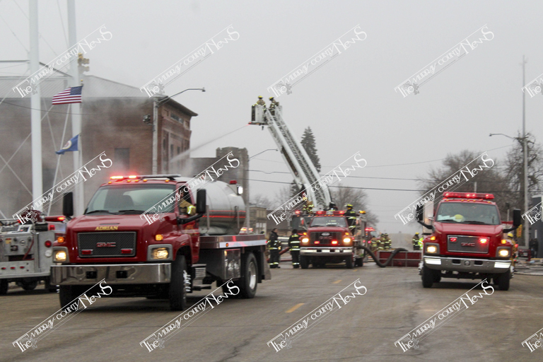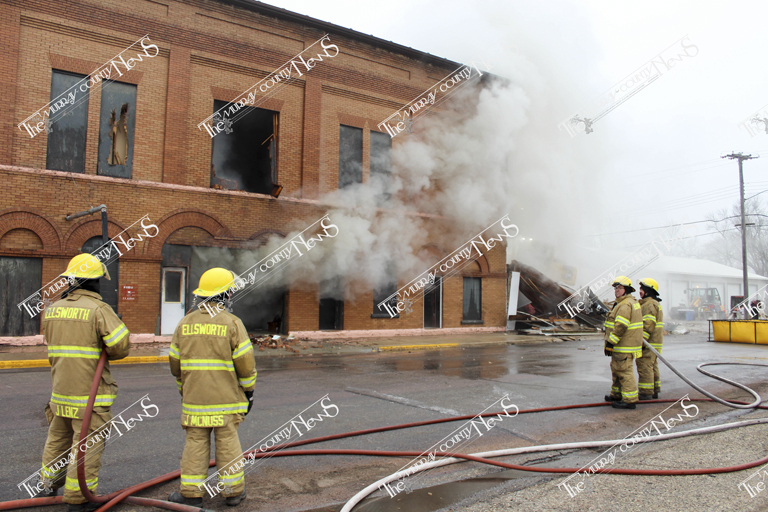 Speaking with Ellsworth Mayor Tasha Domeyer there were 10 area fire departments with trucks and/or personnel helping fight the blaze. Mayor Domeyer stated that the building is a loss and the worry was that the building would collapse into the city water tower. Henning Construction from Adrian was called to knock down the building as fire departments fought the flare-ups. Mayor Domeyer commented, “we are grateful we have a new cell tower so our cell phones were working. Everyone in this small community is willing to step in and help. We were able to get the city clerks computer out before the blaze was able to reach the office so we saved a lot of the records. It is sad to see this landmark go.”
