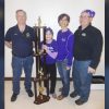 Lion Rick Like is with Janese and Jim Siedschlag and their daughter, Royale, alongside the traveling trophy representing the MCC Staff.